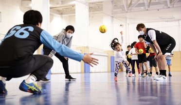 プロのすごい技を見て、チャレンジしてみよう!今回、ハンドボールチームの三重バイオレットアイリスの選手たちが来てくれます。プロ選手と一緒にゲームをしながら、みんなもプロの技に挑戦してみよう! ゴールの前に、得点が書かれた的を置いて「ストラックアウト」をやってみよう!選手たちのすごいシュートを見たり、実際に自分でもやってみたりして、ハンドボールの楽しさを感じてね!